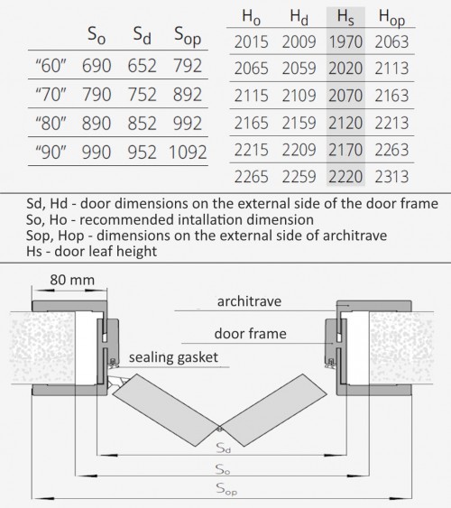 AUSSENVERSTELLBARE ABMESSUNGEN DER TÜRARCHITEKTUR Höhe: 2063 mm(1970 mm Türblatt) Höhe: 2113 mm (2020 mm Türblatt) Höhe: 2163 mm (2070 mm Türblatt) Höhe: 2213 mm (2120 mm Türblatt) Höhe: 2263 mm (2170 mm Türblatt) Höhe: 2313 mm (2220 mm Türblatt) Breite: 792 mm;892 mm;992 mm;1092; 1192 mm.