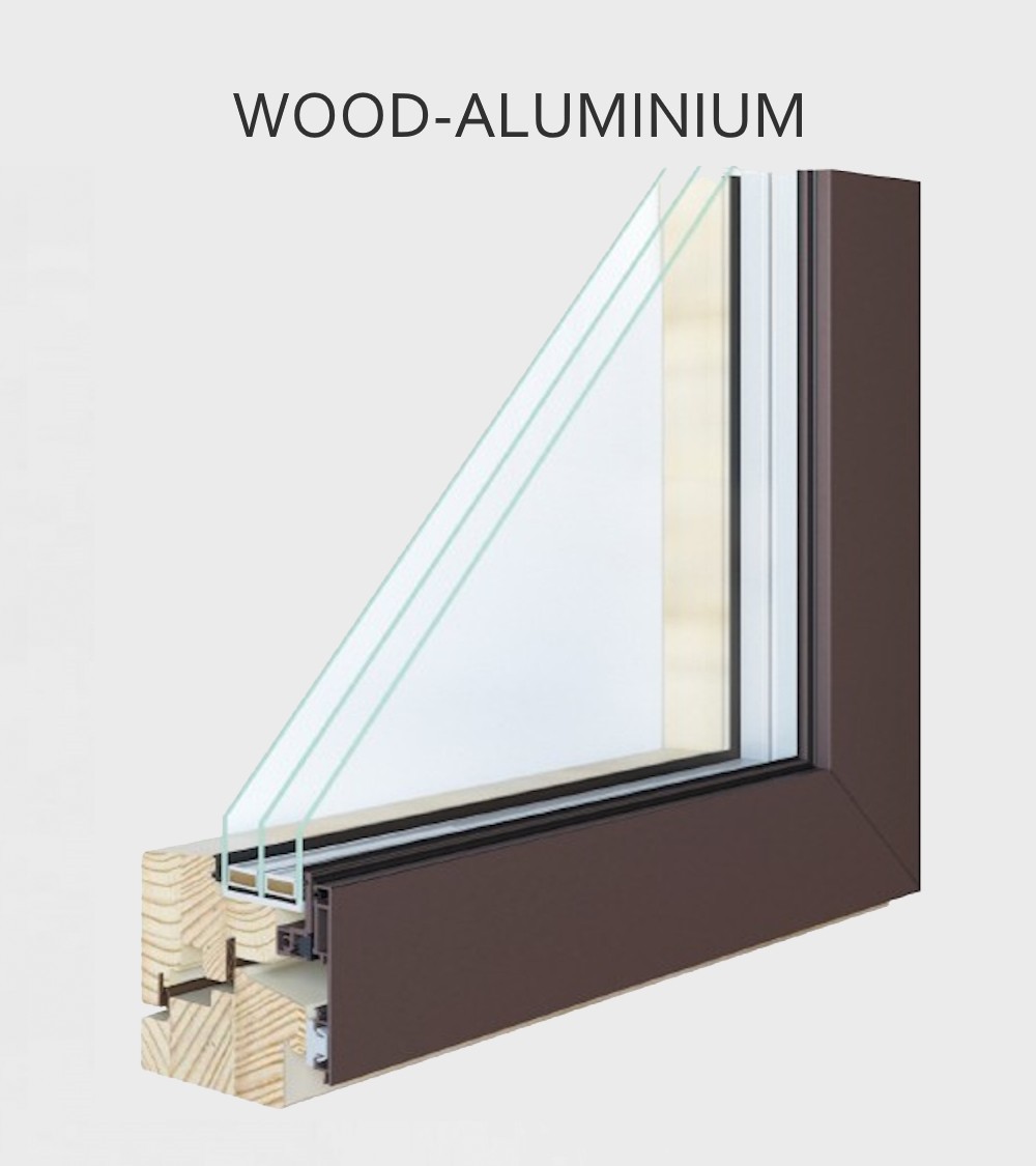 Einrahmenfenster, Holz-Aluminium, Flügelstärke 76 mm, Rahmenstärke 92 mm, mit 105 mm Deckschicht, außen verdeckt liegender Flügel, innen rahmenbündig