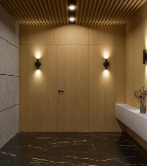 Aluminiumsdørrammen er usynlig efter montering, indbygget i åbninger eller behandlet med gipsplader. Efter færdiggørelse af murværket er kun snittet af rammen synligt, klar til maling, for eksempel farven på væggene.