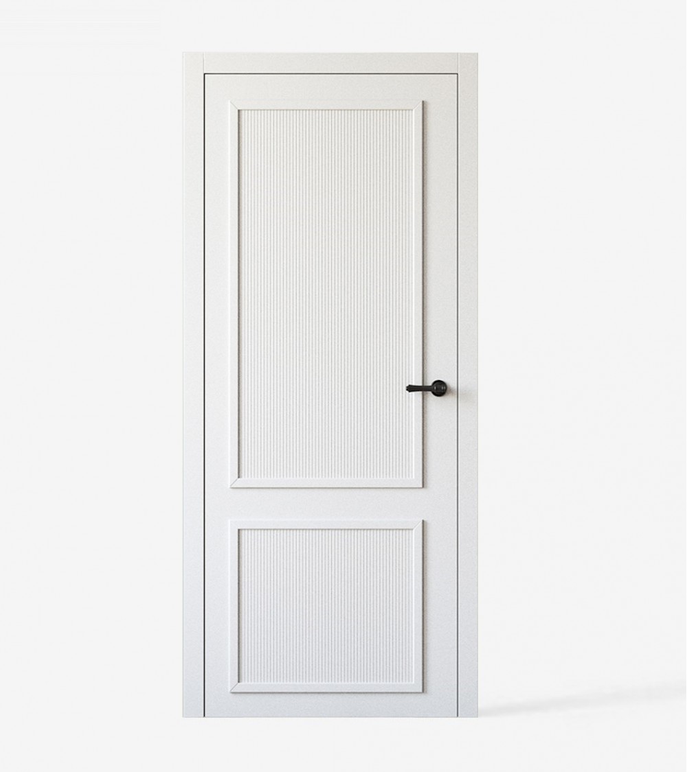 The frame of the door leaf constructed with a wooden rail and stail set topped with two HDF pained boards with decorative fluting and decorative 30 mm thick moulding in the colour of the leaf.