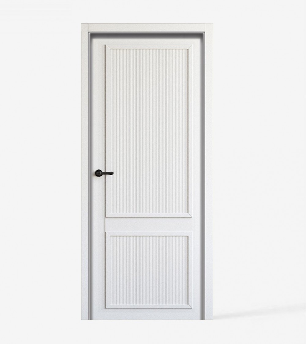 Het kozijn van het deurblad bestaat uit een houten regel en leuning, afgedekt met twee MDF-gelakte panelen met decoratieve cannelures en een decoratieve lijst van 30 mm dik in de kleur van het deurblad.