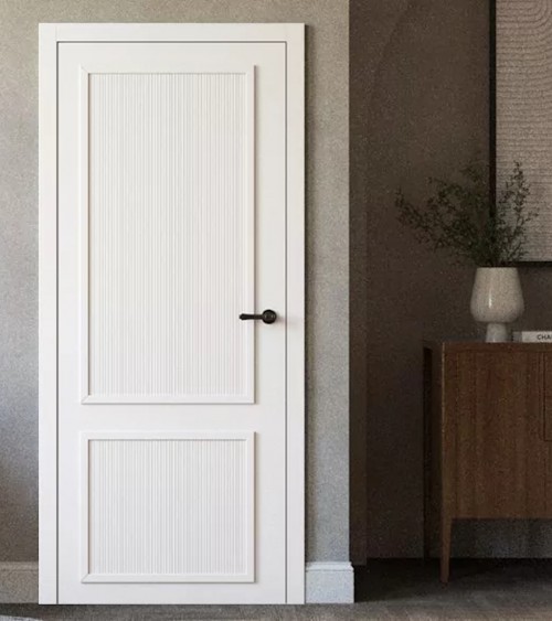 Het kozijn van het deurblad bestaat uit een houten regel en leuning, afgedekt met twee MDF-gelakte panelen met decoratieve cannelures en een decoratieve lijst van 30 mm dik in de kleur van het deurblad.