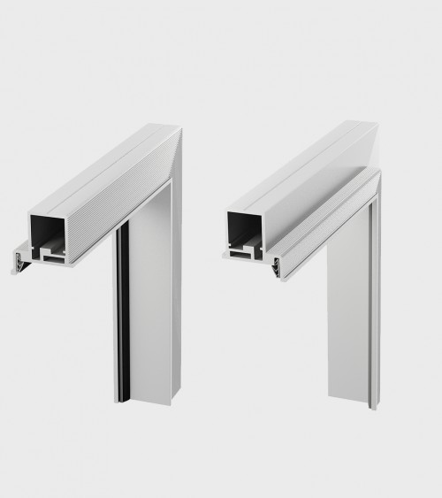 Verdektliggend deurkozijn voor naar binnen of naar buiten openende deuren. Gemaakt van geanodiseerd aluminium, ruw aluminium om zelf te schilderen in de kleur van de muur of geverfd in wit (RAL 9003), zwart (RAL 9005); grijs (RAL 7047), zand (NCS S 2005-Y50R).