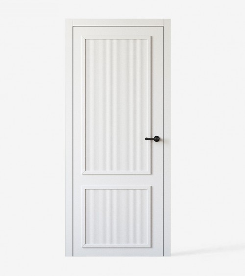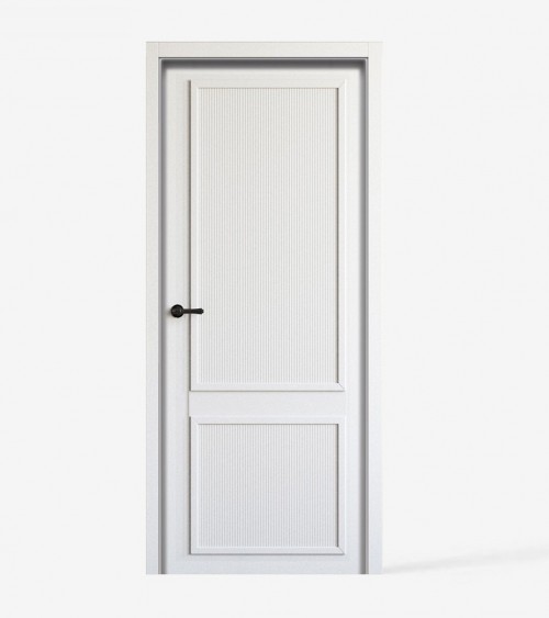 Dörrbladets karm är konstruerad med en träskena och stjälk med två målade MDF-skivor med dekorativa räfflor och dekorativ 30 mm tjock list i dörrbladets färg.